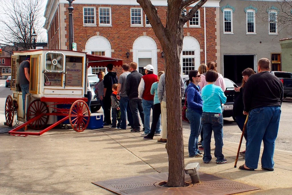 Dating to 1913, this quaint outdoor wagon serves simple hamburgers topped with pickles & onions.